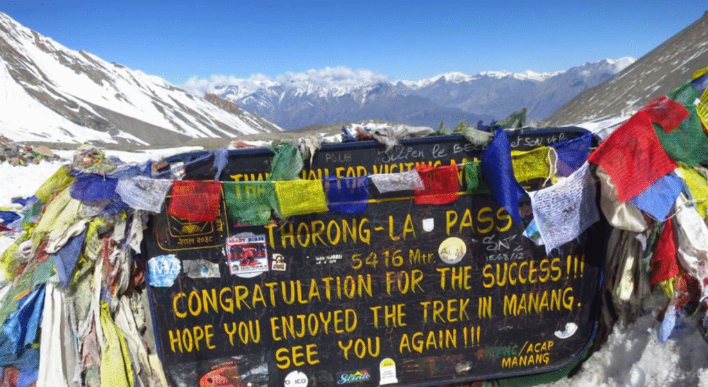 Thorong-La Pass is the highest point of the trek at 5,416 meters (17,769 ft).